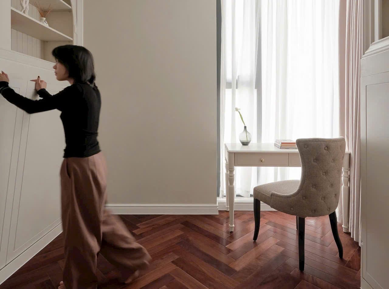 Sàn gỗ tự nhiên sẽ là lựa chọn tuyệt vời với phong cách thiết kế tân cổ điển. Sắc nâu socola của gỗ wanut hoặc sự nhẹ nhàng tối giản của gỗ sồi cũng là một trong những lựa chọn được ưa chuộng.
