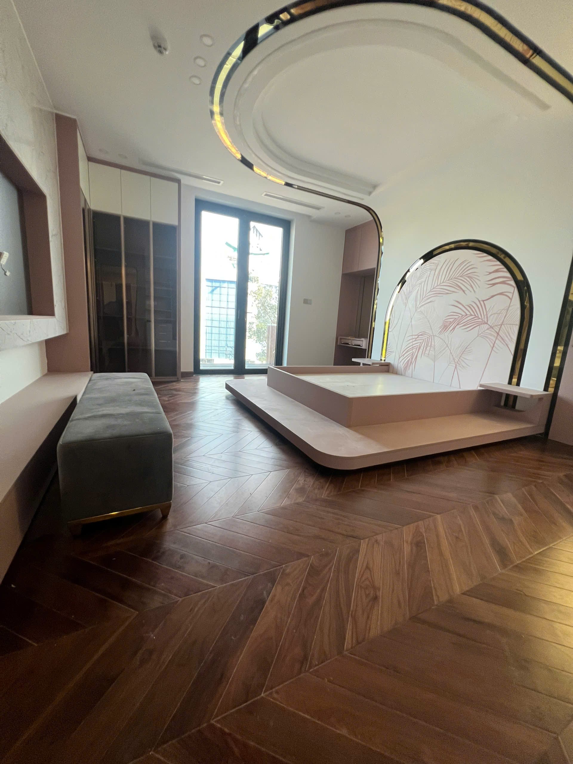 - Loại sàn sang trọng, màu nâu socola trầm để tương phản với màu tường và nội thất màu sáng